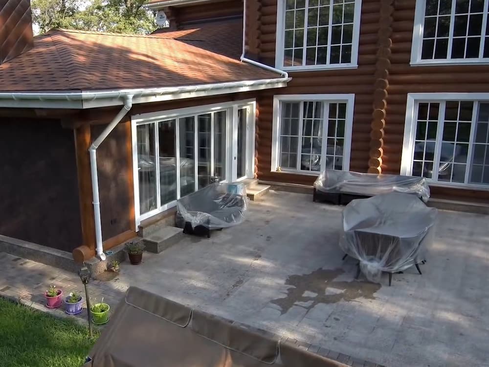 Выполненные работы: Установлена портально-сдвижная дверь, Профильная система REHAU Thermo, Ламинация изделий под дерево, Фурнитура Siegenia, Стеклопакет 40 мм с i-стеклом