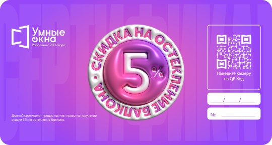 Скидка 5% на остекление балкона или лоджии при заказе в период действия акции «Выгодные балконы».